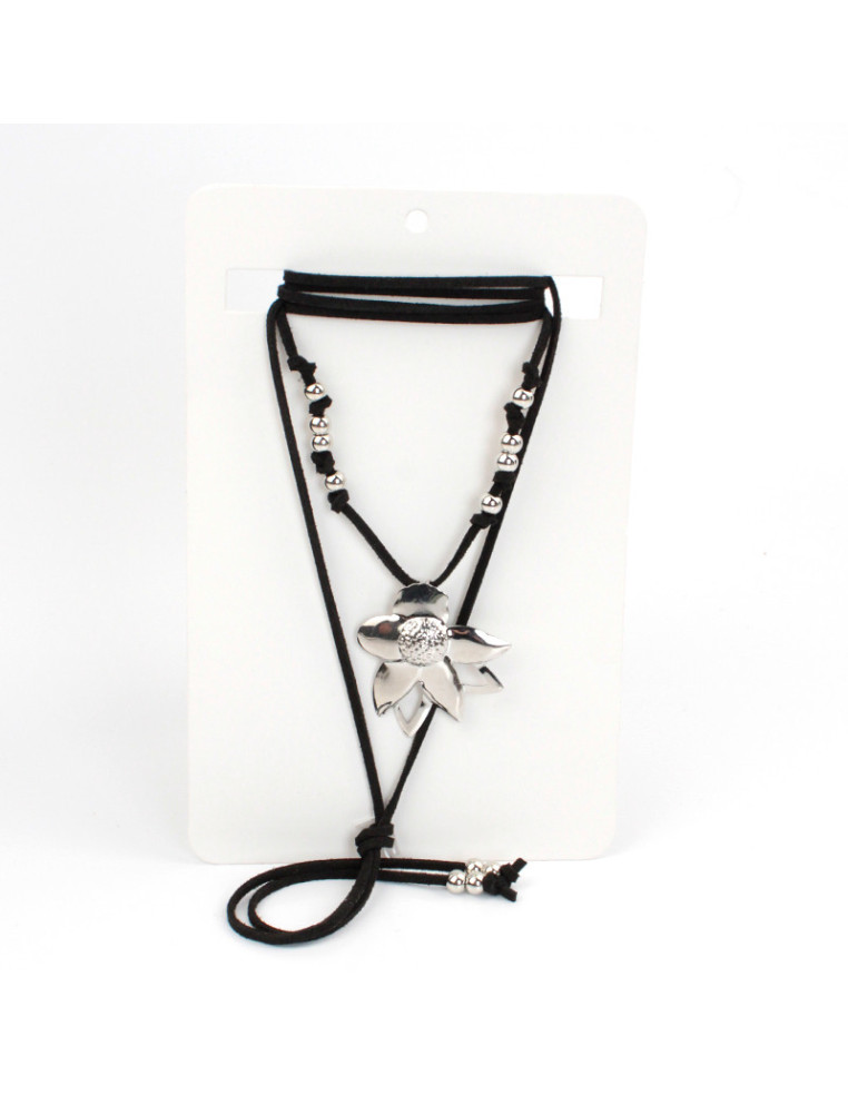 Collar de gamuza de múltiples vueltas, con dije exclusivo de metal con forma de flor y terminales en punteras.