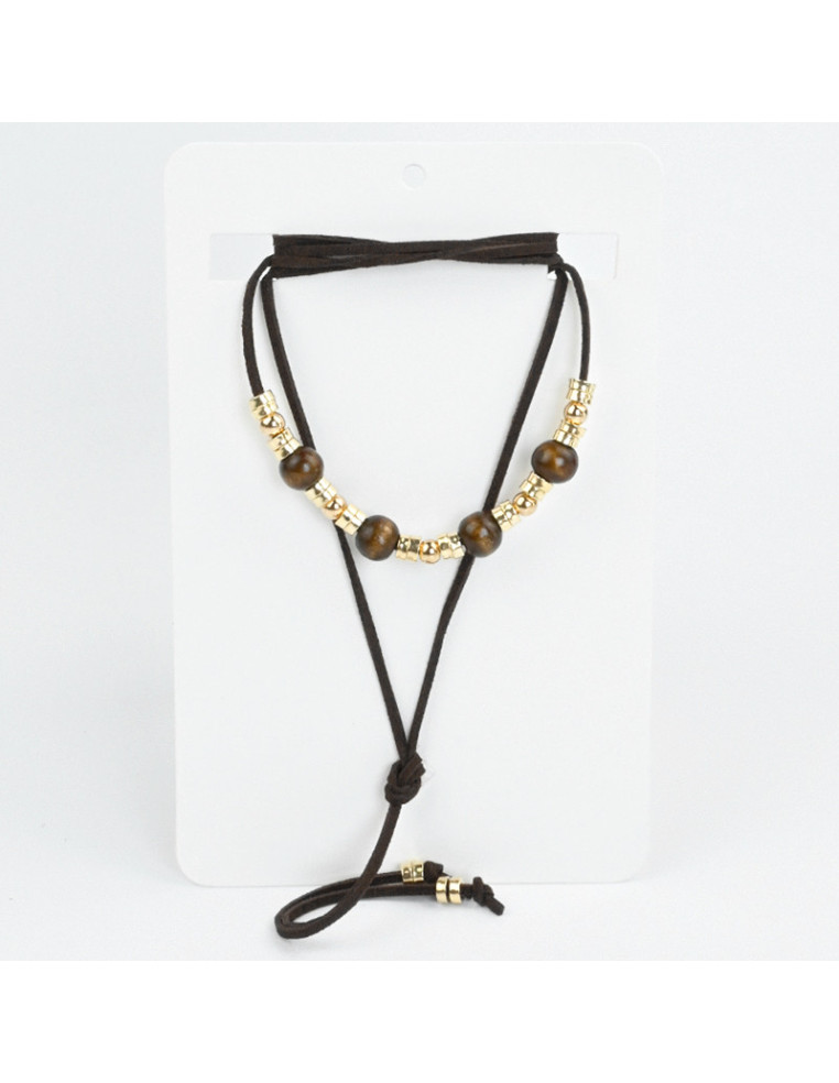 Collar de gamuza de múltiples vueltas, con piezas exclusivas de madera, combinadas con piezas de CCB y terminales en punteras.