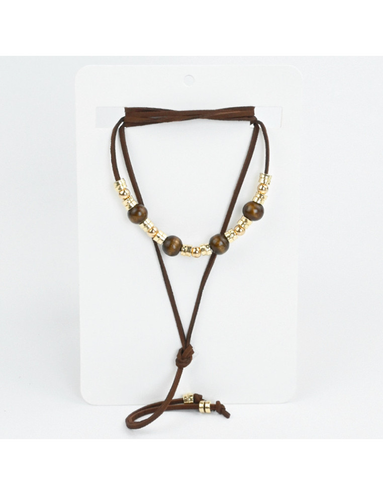 Collar de gamuza de múltiples vueltas, con piezas exclusivas de madera, combinadas con piezas de CCB y terminales en punteras.
