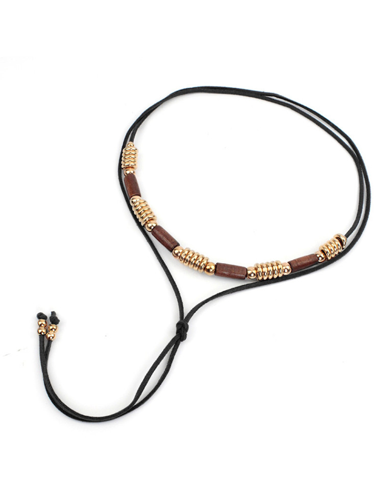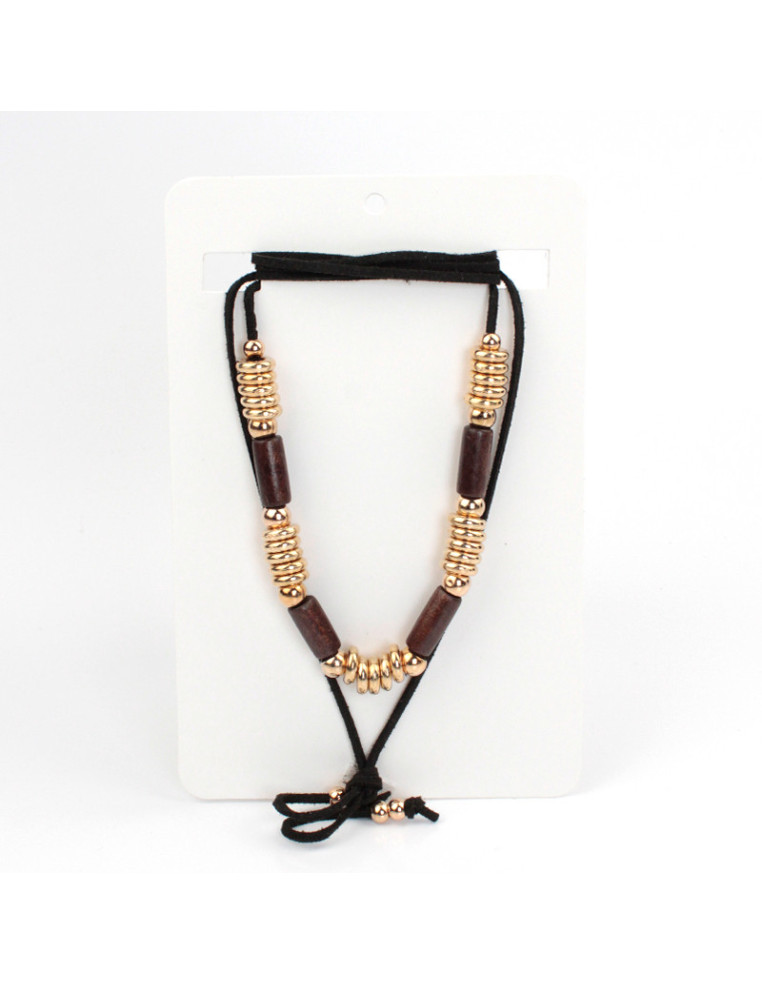 Collar de gamuza de múltiples vueltas, con piezas exclusivas de madera combinadas con pasantes de CCB y terminales en punteras. Medida: 140cm de largo.