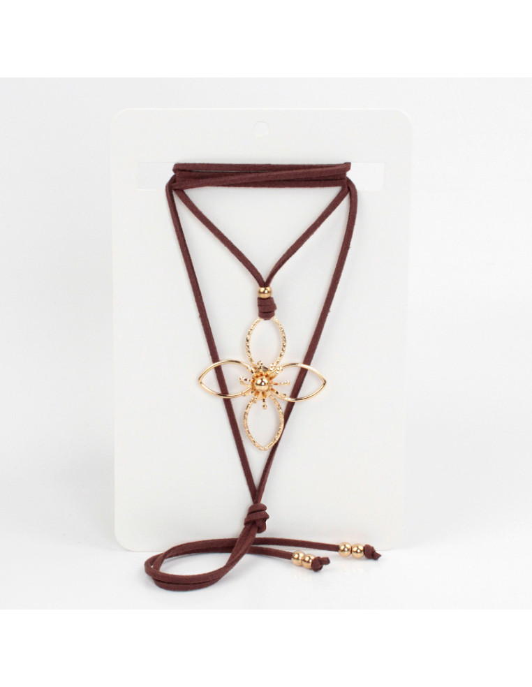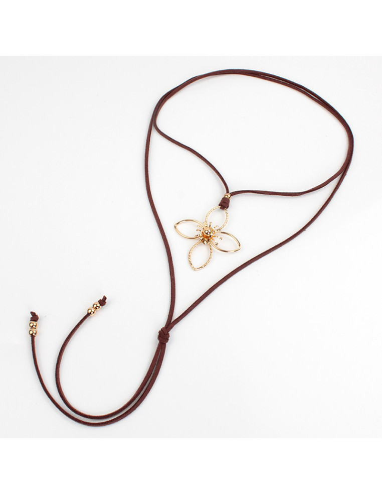 Collar de gamuza de múltiples vueltas, con dije exclusivo de metal con forma de flor y terminales en punteras.