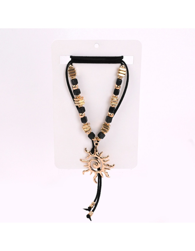 Collar de gamuza de múltiples vueltas, enhebrada con piezas pasantes exclusivas, dije exclusivo de fundición con forma de sol y terminales en punteras.