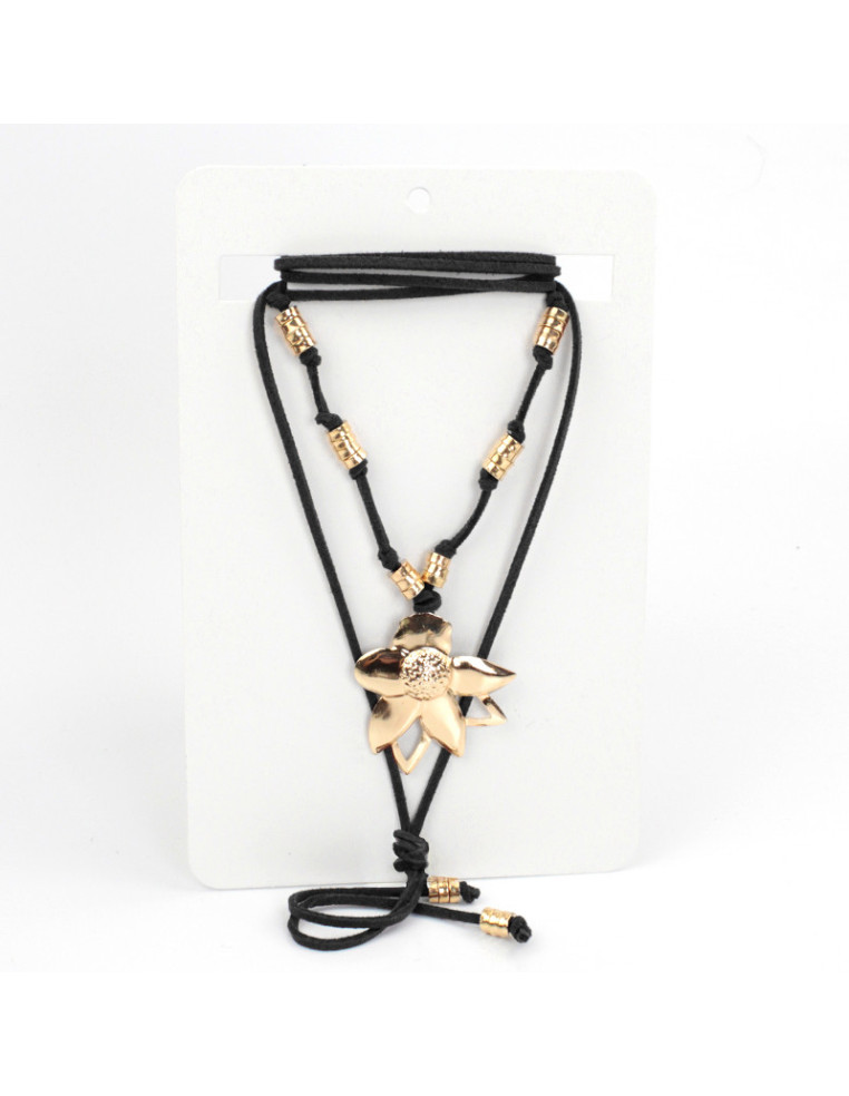 Collar de gamuza de múltiples vueltas, con dije exclusivo de metal orgánico dorado, pasantes de CCB y terminales en punteras.Medida: 140cm de largo.