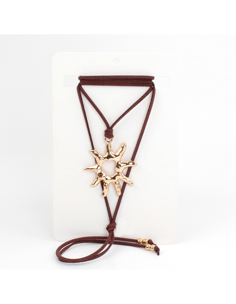 Collar de gamuza de múltiples vueltas, con dije exclusivo de fundición premium con forma de sol y terminales en punteras.Medida: 140cm de largo.