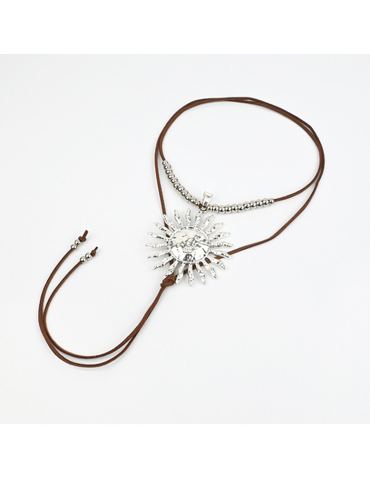 Collar de gamuza de múltiples vueltas, con dije exclusivo con forma de sol y terminales en punteras.