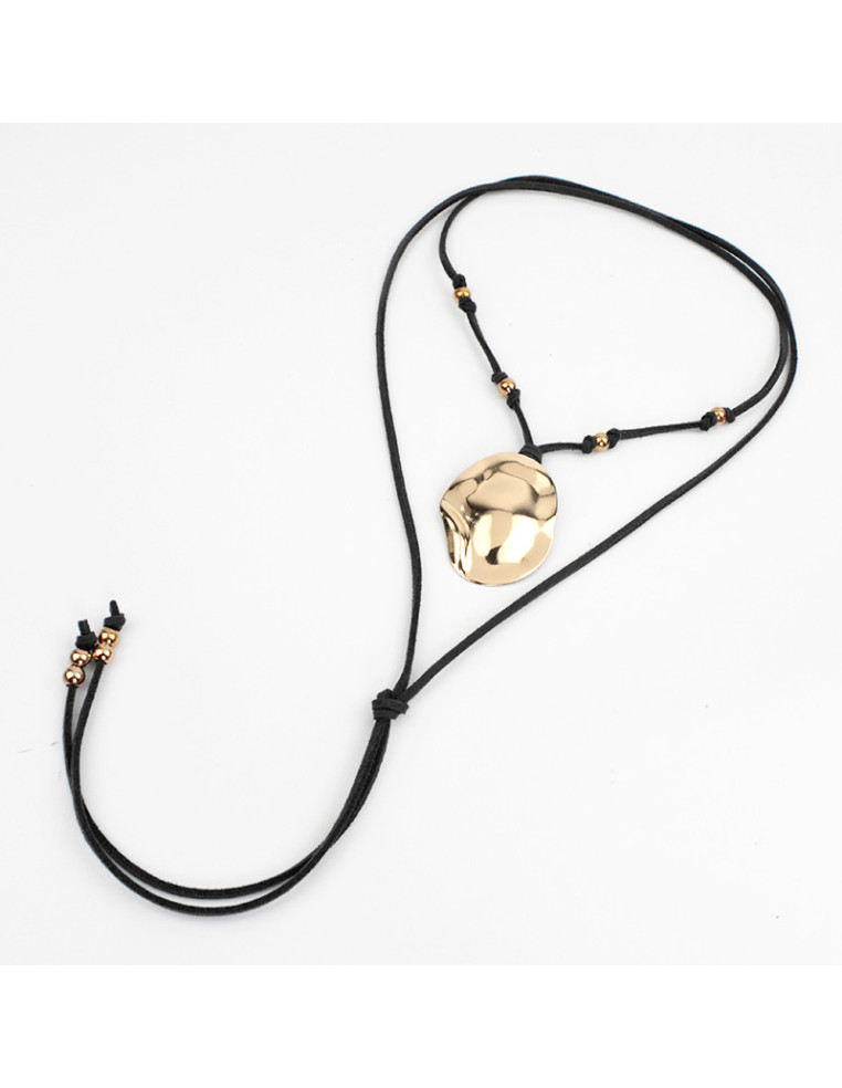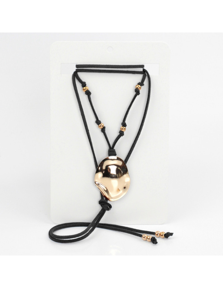 Collar de gamuza de múltiples vueltas, con dije exclusivo de metal orgánico dorado, pasantes de CCB y terminales en punteras.