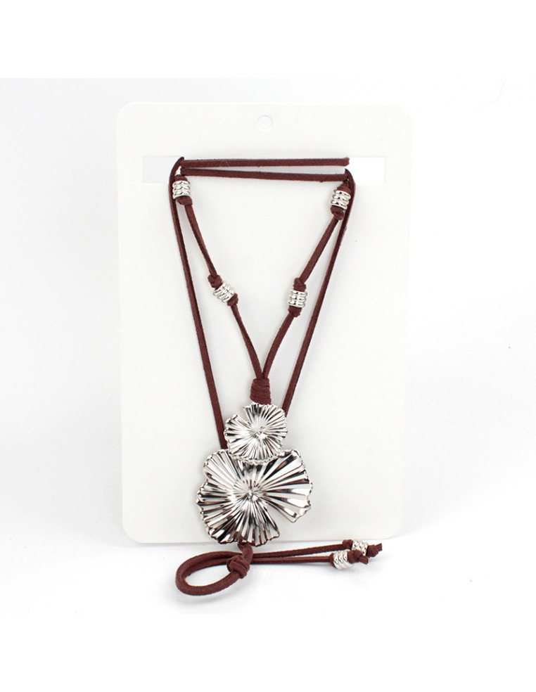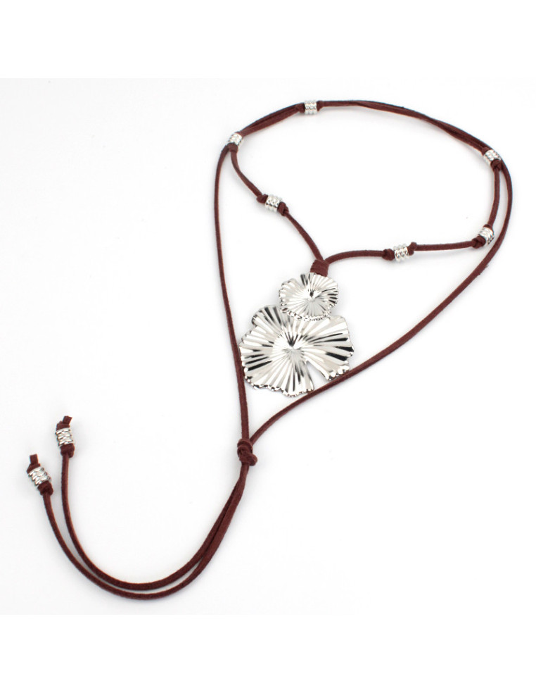 Collar de gamuza de múltiples vueltas, con dije exclusivo de metal con forma de flor y terminales en punteras.
