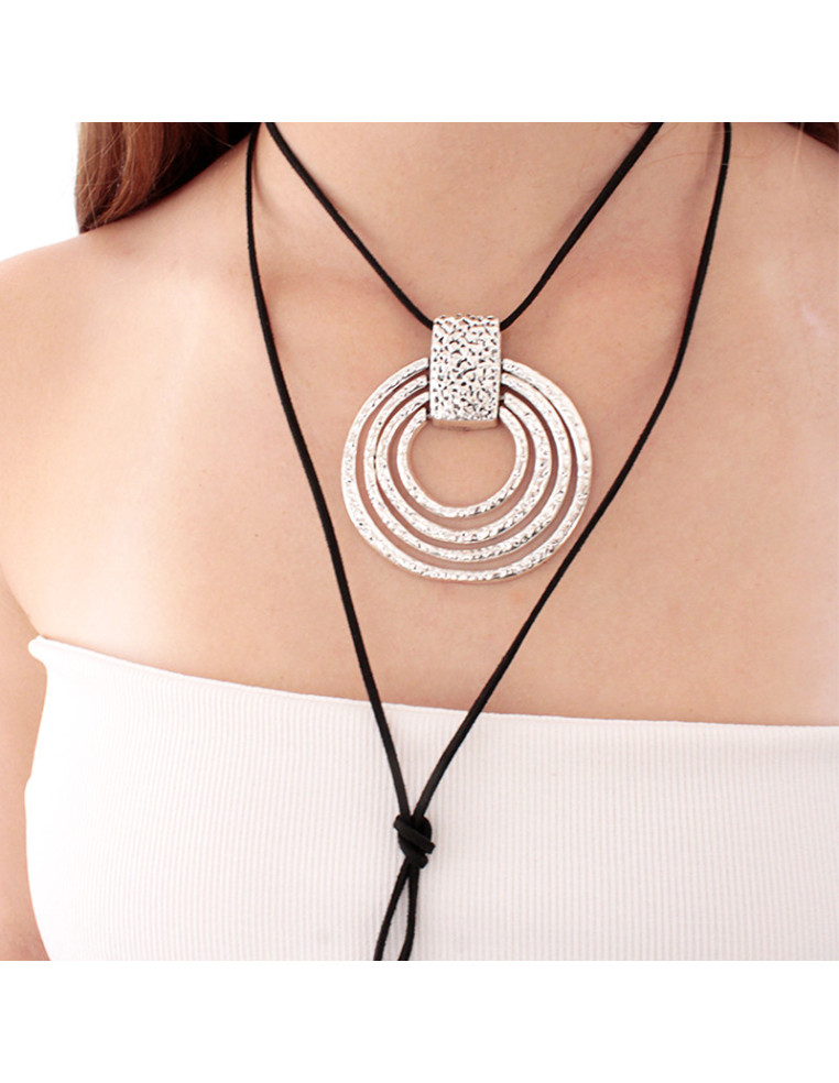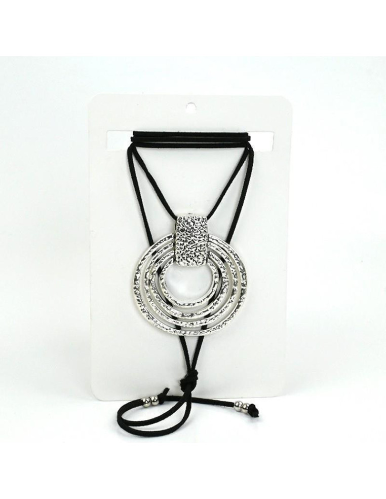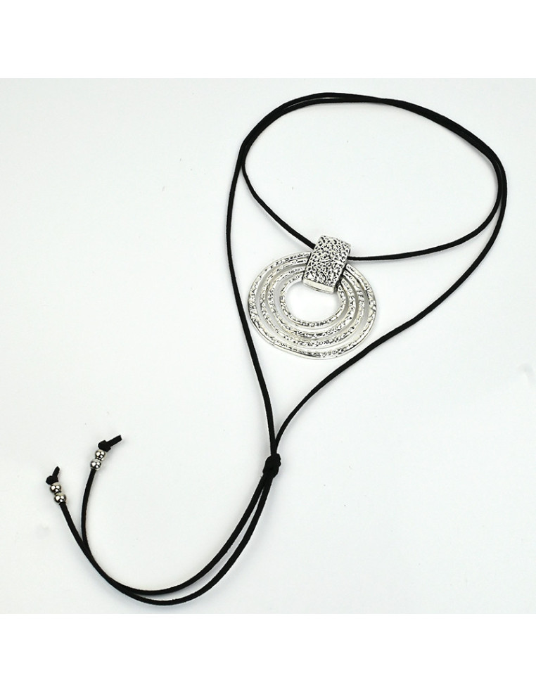 Collar de gamuza de múltiples vueltas, con dije exclusivo de fundición de múltiples circulos y terminales en punteras. Medida: 140cm de largo.