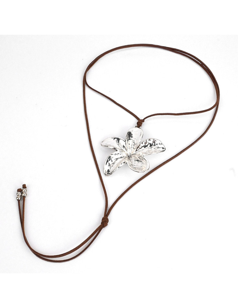 Collar de gamuza de múltiples vueltas, con dije exclusivo de fundición con forma de flor y terminales en punteras.