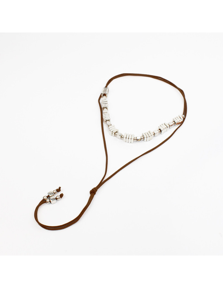 Collar de gamuza de múltiples vueltas, enhebrada con piezas exclusivas de CCB y terminales en punteras.