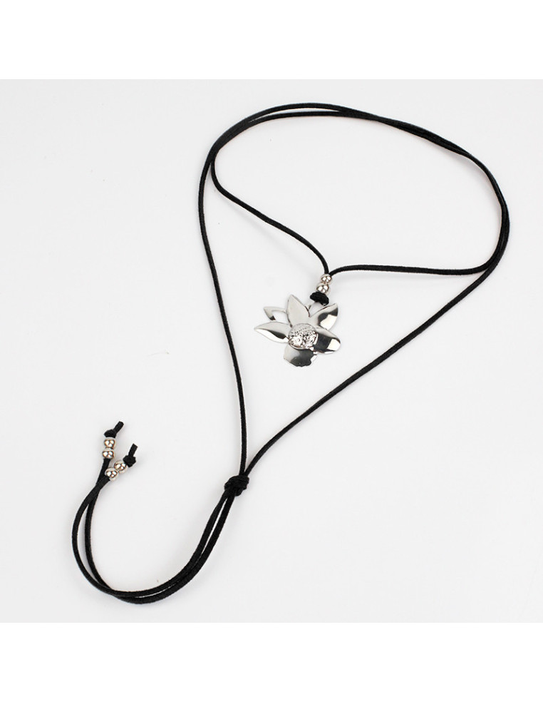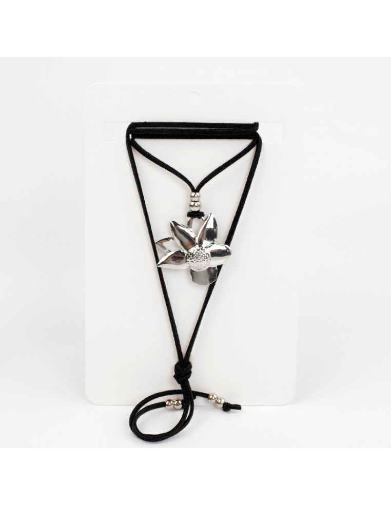 Collar de gamuza de múltiples vueltas con dije de metal con forma de flor orgánica y terminales en punteras.