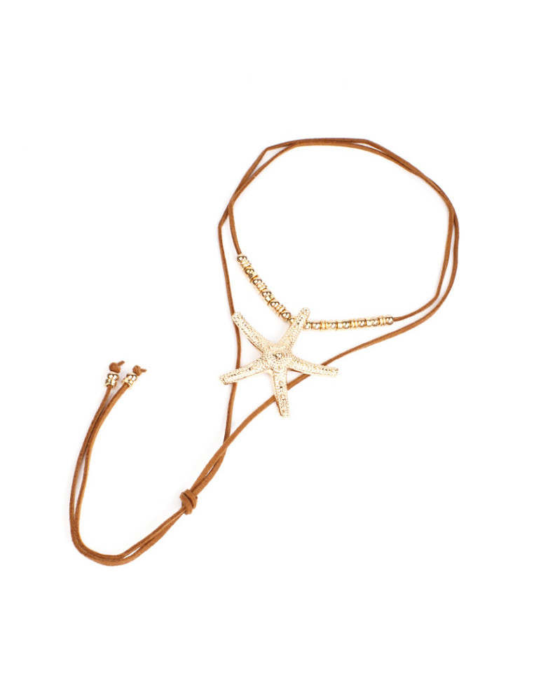 Collar de gamuza de múltiples vueltas, con dije exclusivo de fundición con forma de fundición con forma de estrella de mar, con cuentas enhebradas en la gamuza y terminales en punteras.