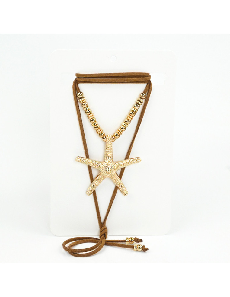 Collar de gamuza de múltiples vueltas, con dije exclusivo de fundición con forma de fundición con forma de estrella de mar, con cuentas enhebradas en la gamuza y terminales en punteras.