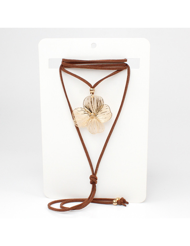 Collar de gamuza de múltiples vueltas, con dije exclusivo de flor filigranada y terminales en punteras.