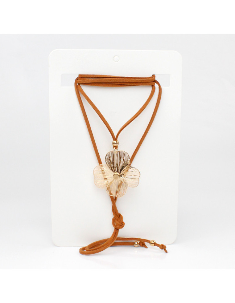 Collar de gamuza de múltiples vueltas, con dije exclusivo de flor filigranada y terminales en punteras.