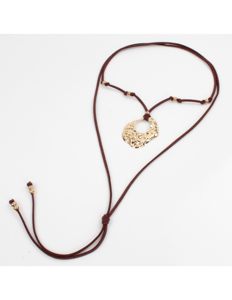 Collar de gamuza de múltiples vueltas, con dije exclusivo de metal de forma orgánica y terminales en punteras.