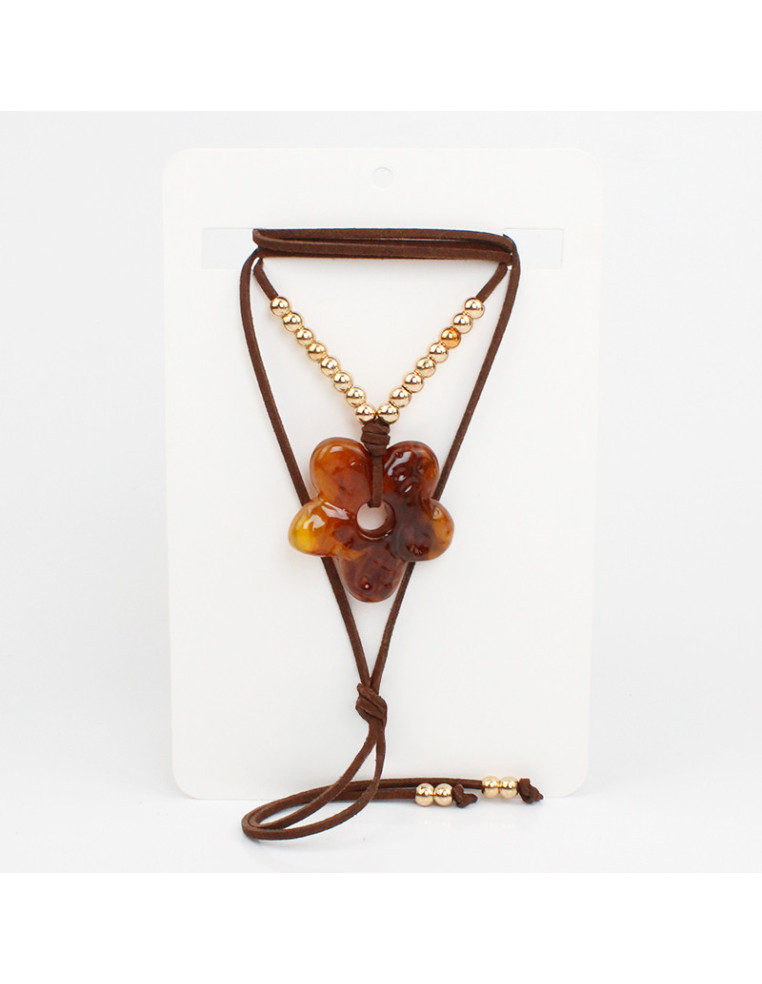 Collar de gamuza de múltiples vueltas, con dije de acrílico con forma de flor y terminales en punteras.