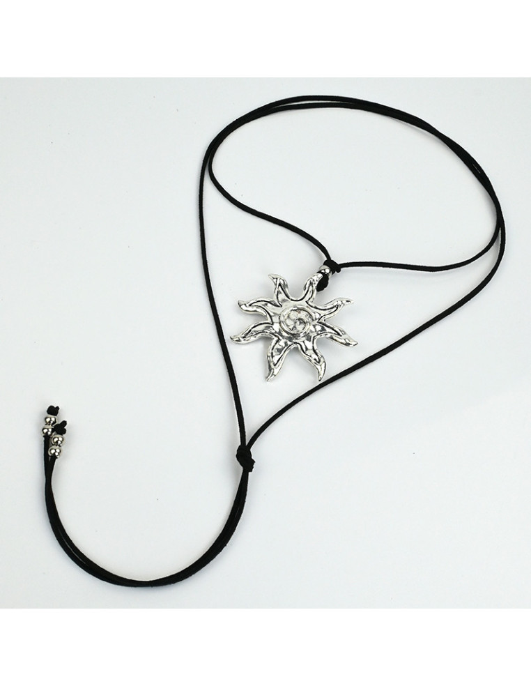 Collar de gamuza de múltiples vueltas, con dije exclusivo de fundición con forma de sol y terminales en punteras.
