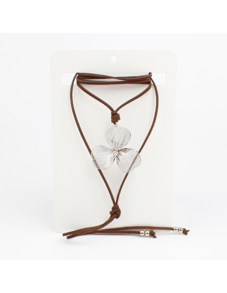 Collar de gamuza de múltiples vueltas, con dije exclusivo con forma de flor filigranada y terminales en punteras.