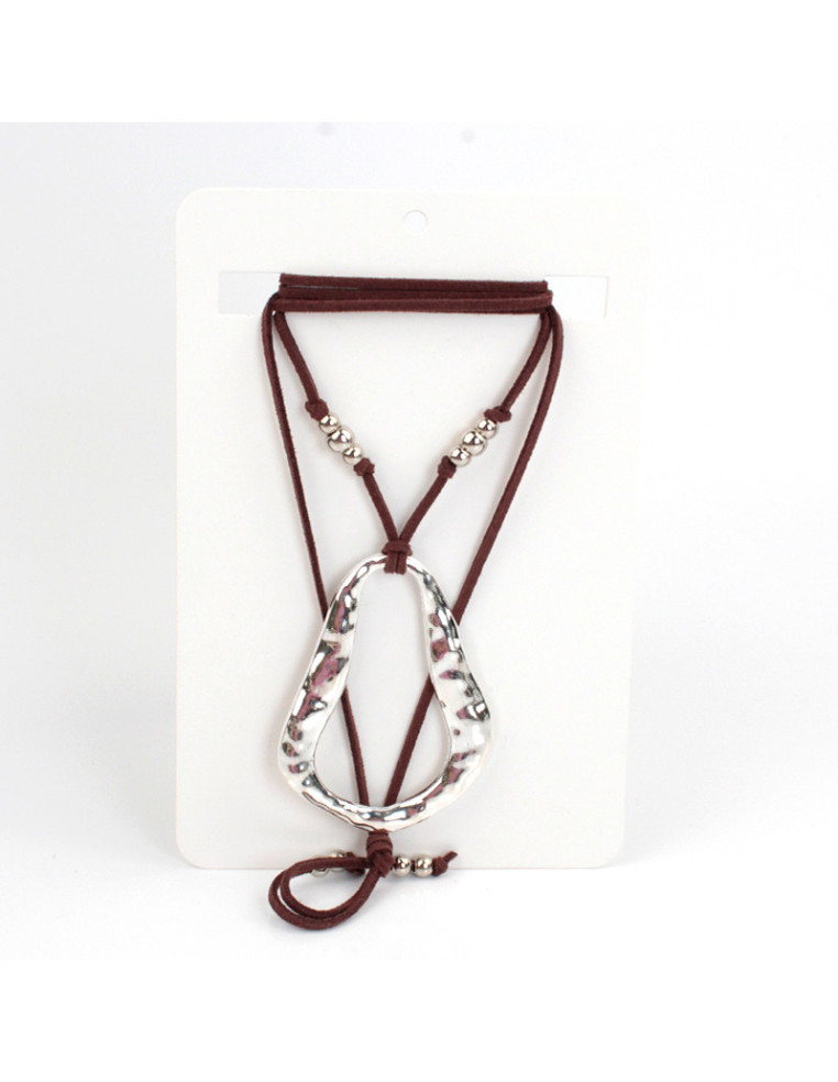 Collar de gamuza de múltiples vueltas, con dije exclusivo de fundición de forma orgánica oval y terminales en punteras. Medida: 140cm de largo.