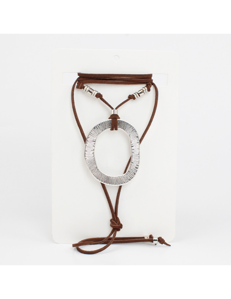 Collar de gamuza de múltiples vueltas, con dije orgánico circular y terminales en punteras.