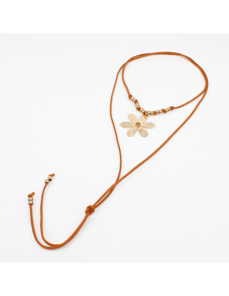 Collar de gamuza de múltiples vueltas, con dije de metal con forma de flor, separadores de CCB y terminales en punteras.