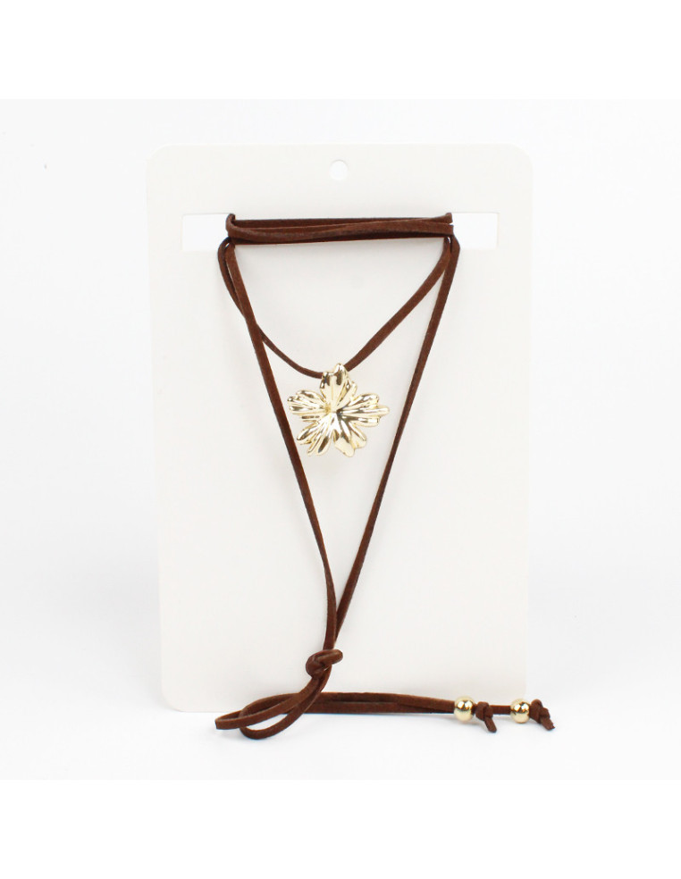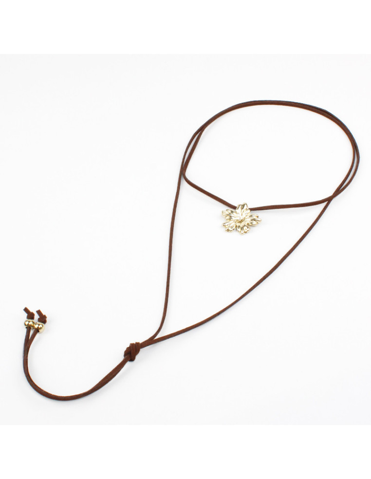 Collar de gamuza de múltiples vueltas, con dije de CCB con forma de flor y terminales en punteras.
