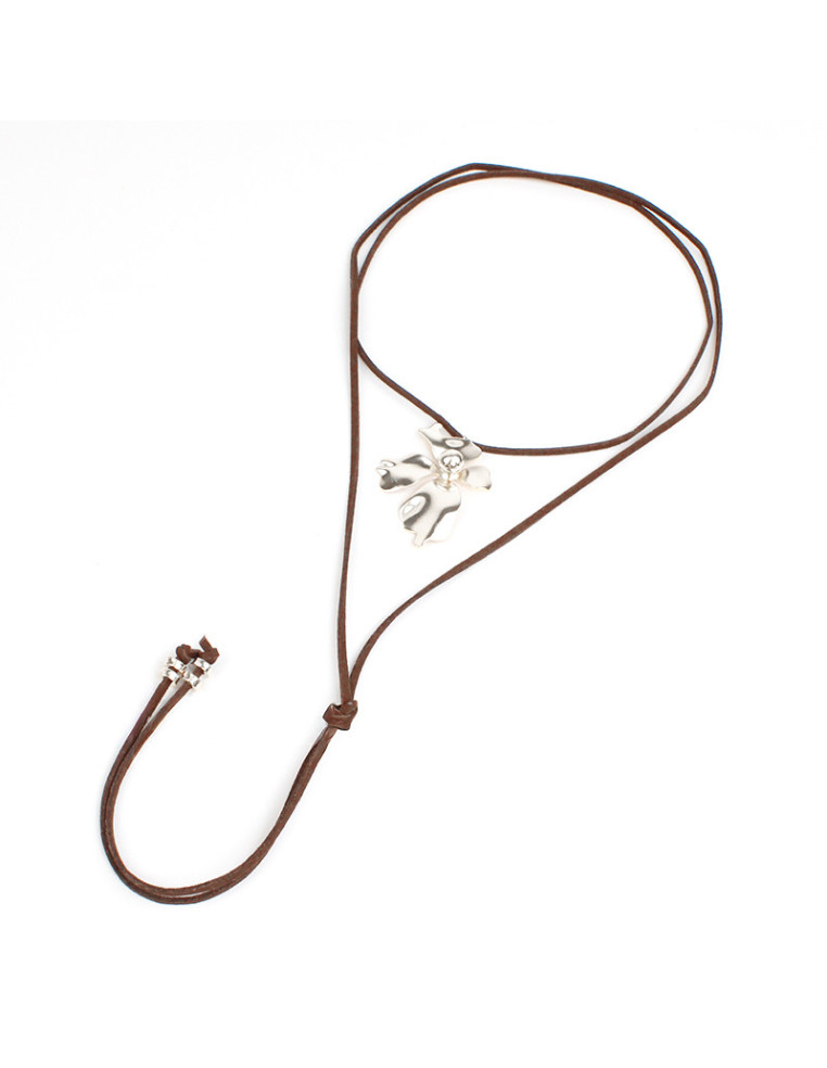 Collar de gamuza de múltiples vueltas, con dije exclusivo de metal con forma de flor y terminales en punteras. Medida: 140cm de largo.
