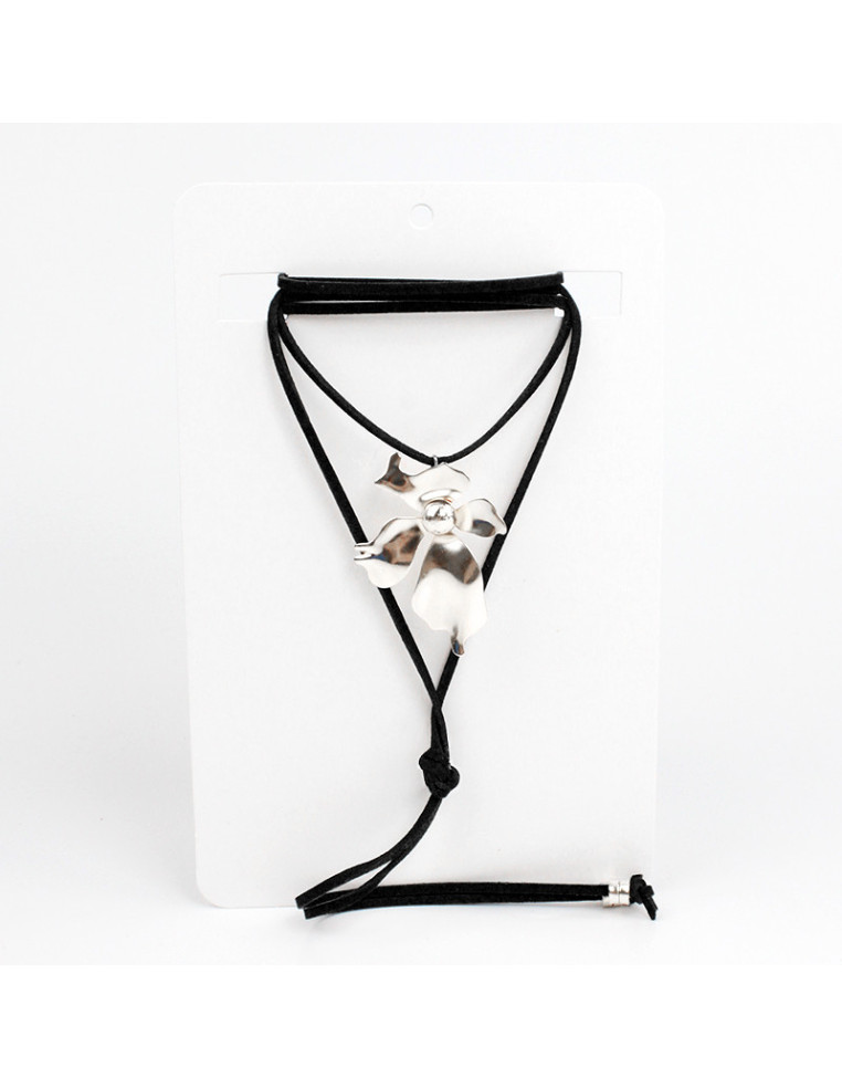 Collar de gamuza de múltiples vueltas, con dije exclusivo de metal con forma de flor y terminales en punteras. Medida: 140cm de largo.