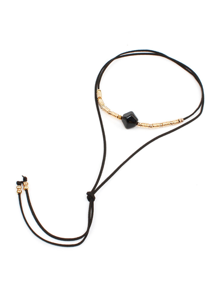 Collar de gamuza de múltiples vueltas, con dije de acrílico, piezas pasantes de CCB y terminales en punteras. Medida: 140cm de largo.