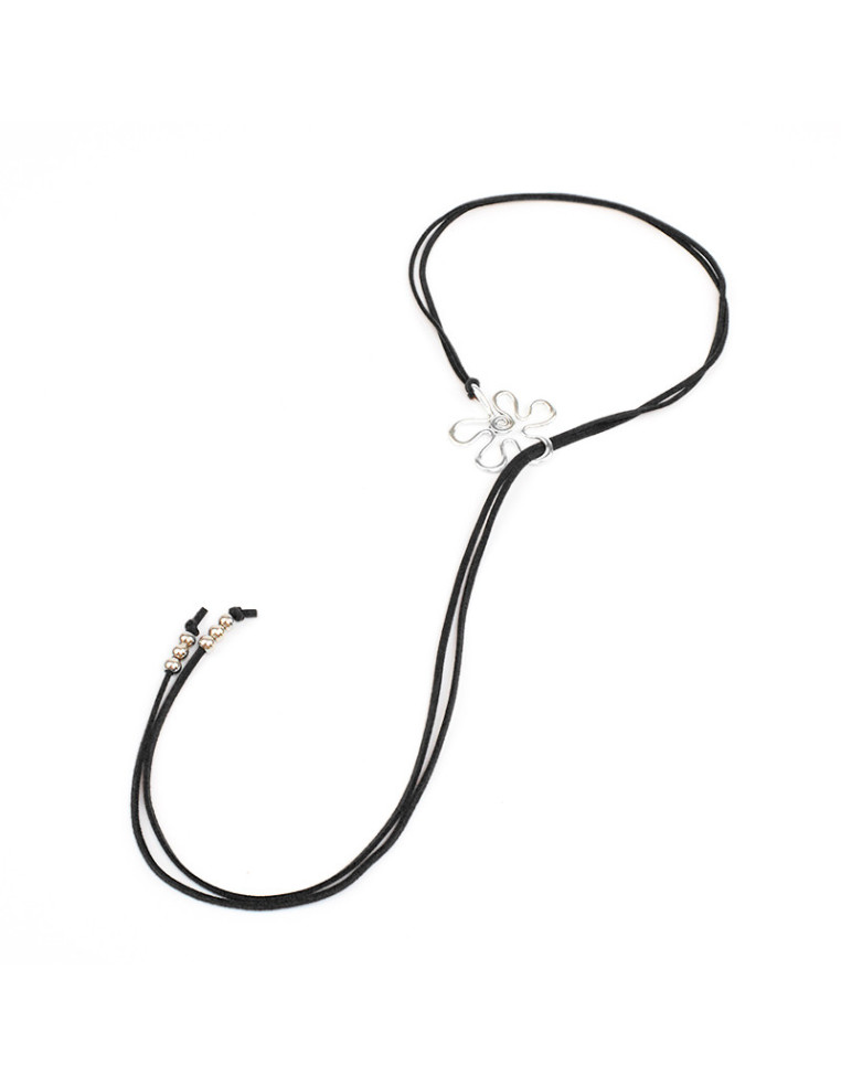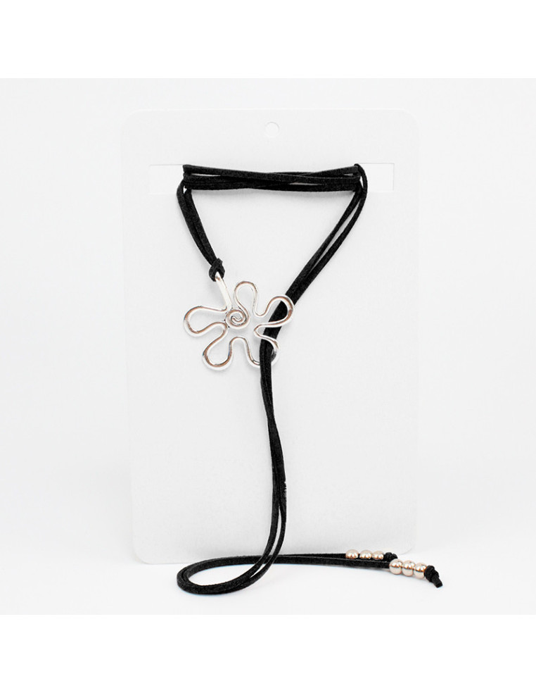 Collar corbatero de gamuza con dije de fundición con forma de flor y terminales en punteras.