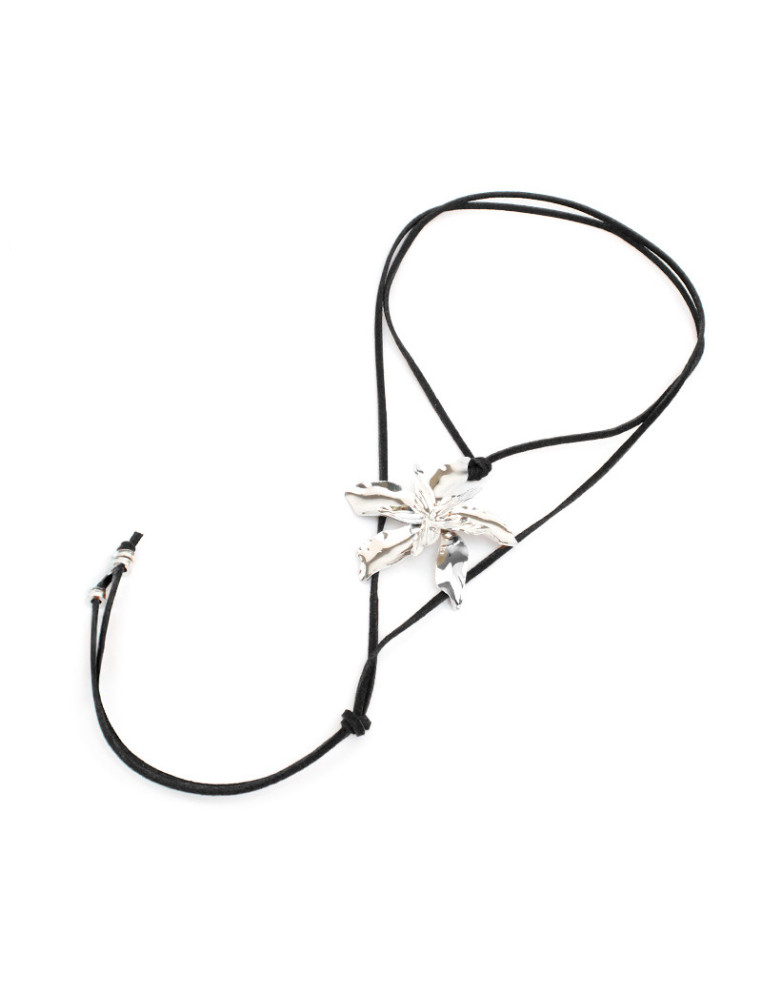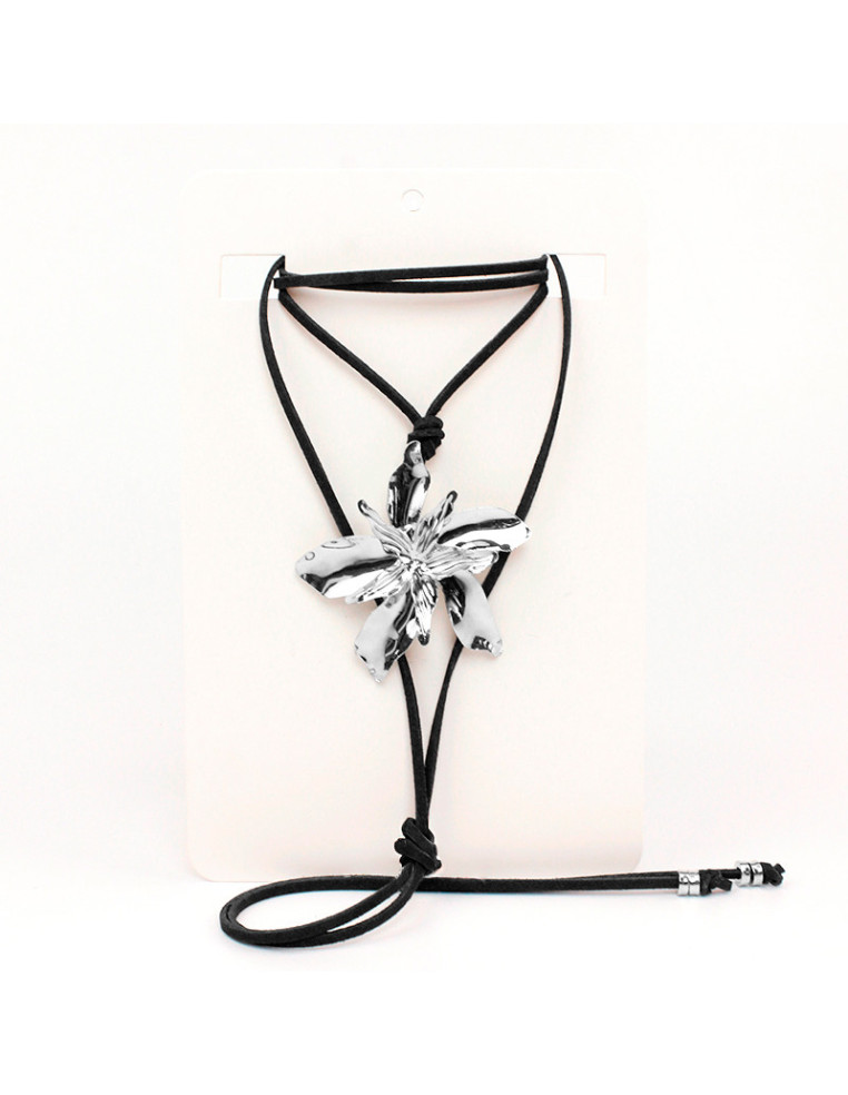 Collar de gamuza de múltiples vueltas, con dije de metal con forma de flor y terminales en punteras.