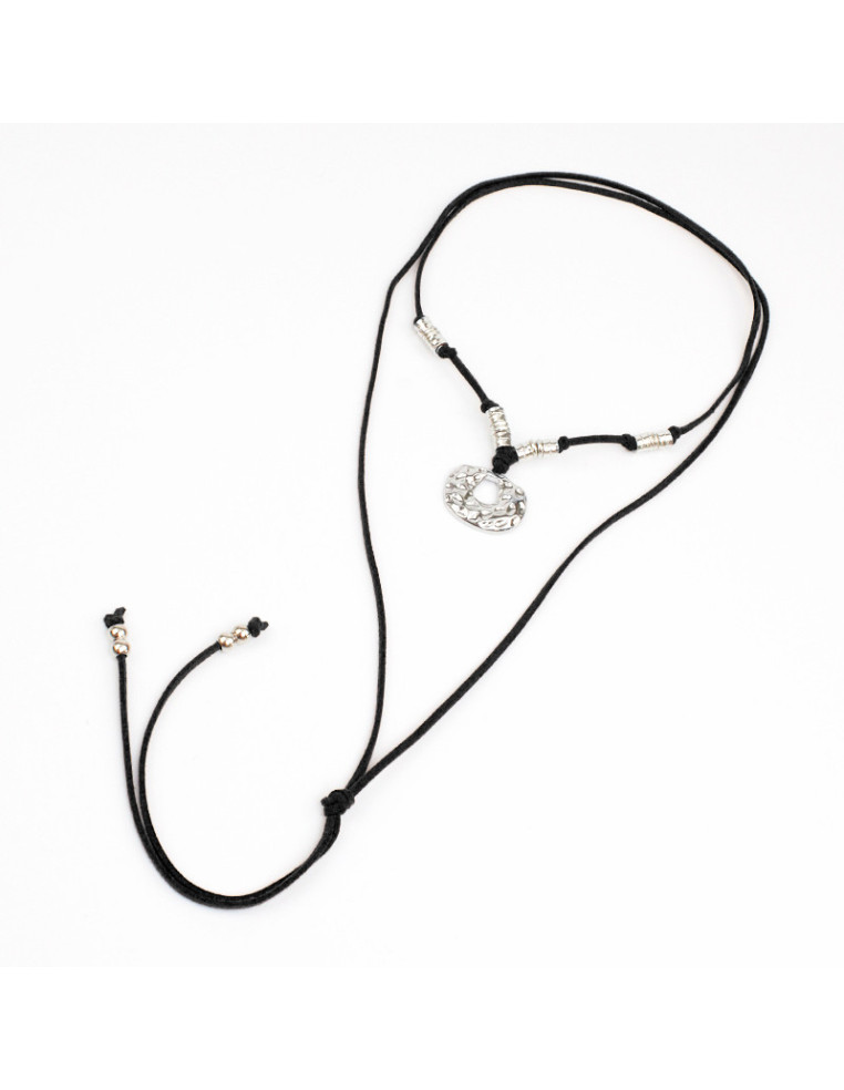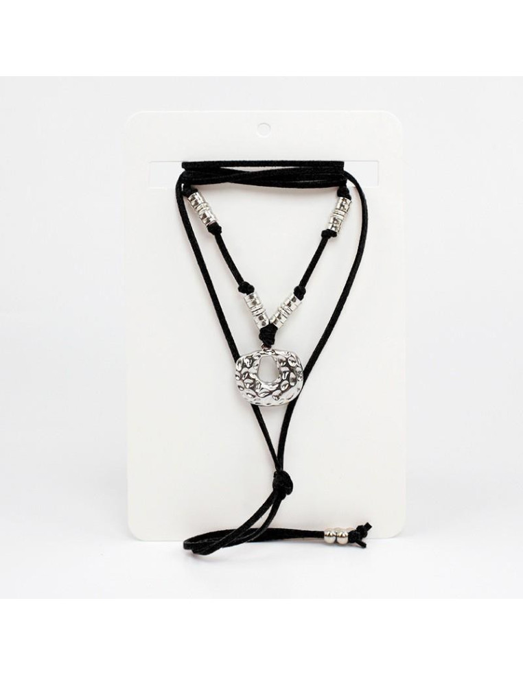 Collar de gamuza de múltiples vueltas, con dije de fundición golpeado, pasantes de CCB y terminales en punteras.
