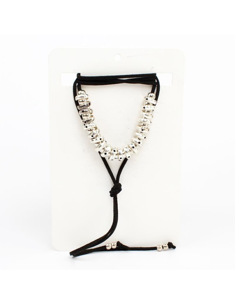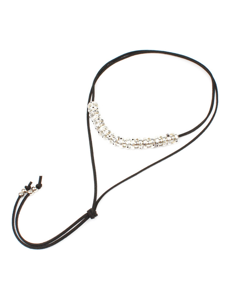 Collar de gamuza de múltiples vueltas, con piezas pasantes de fundición y terminales en punteras. Medida: 140cm de largo.