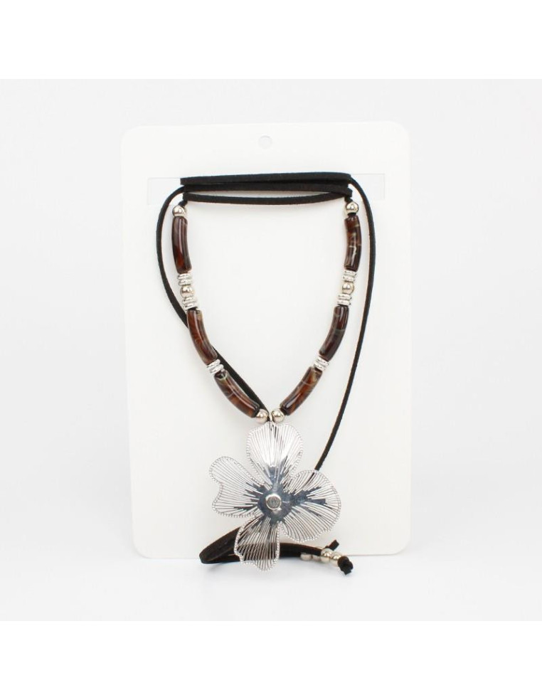 Collar de gamuza de múltiples vueltas, con dije de metal con forma de flor, cuentas de acrílico y terminales en punteras.