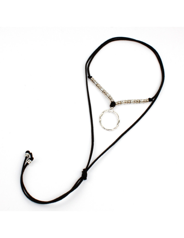 Collar de gamuza de múltiples vueltas, con dije de fundición, pasantes de CCB y terminales en punteras. Medida: 140cm de largo.