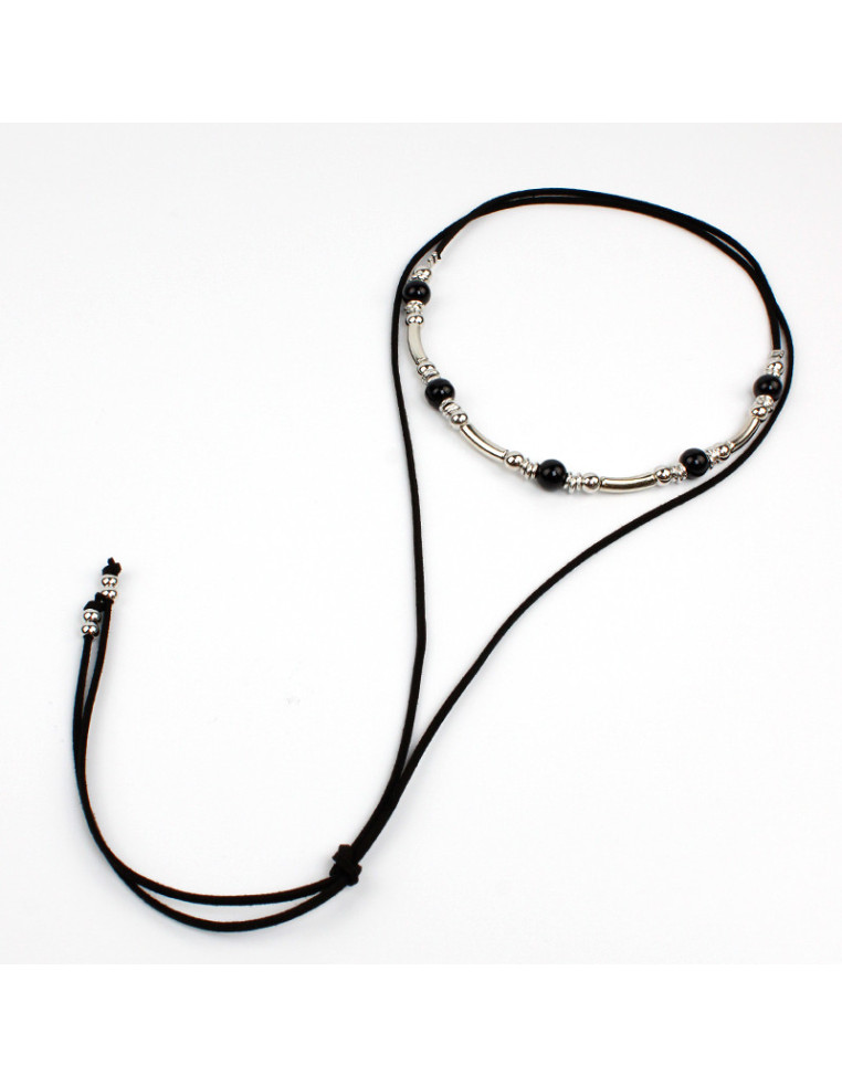 Collar de gamuza de múltiples vueltas, con pasantes de CCB, cuentas de vidrio y terminales en punteras.