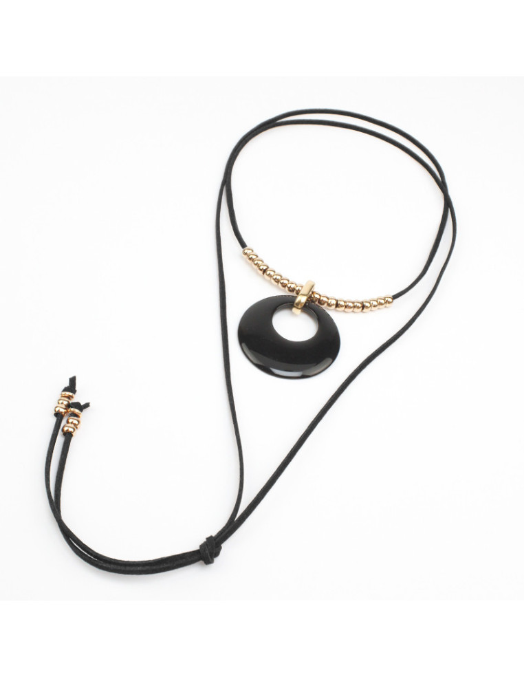 Collar de gamuza de múltiples vueltas, con dije de acrílico, pasantes de CCB y terminales en punteras.