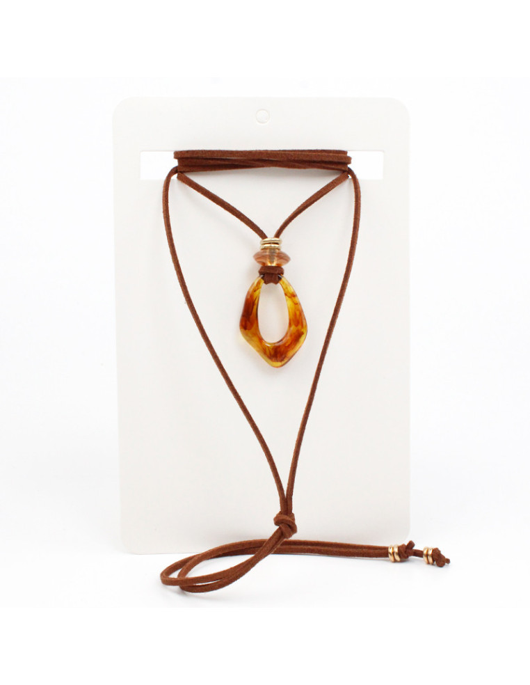 Collar de gamuza de múltiples vueltas, con dije de acrílico y terminales en punteras.