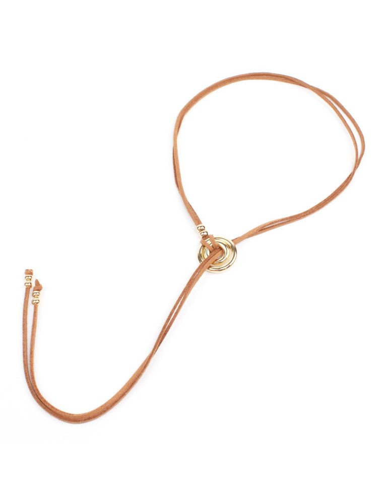 Collar corbatero de gamuza con argollas de CCB doradas y terminales en punteras.