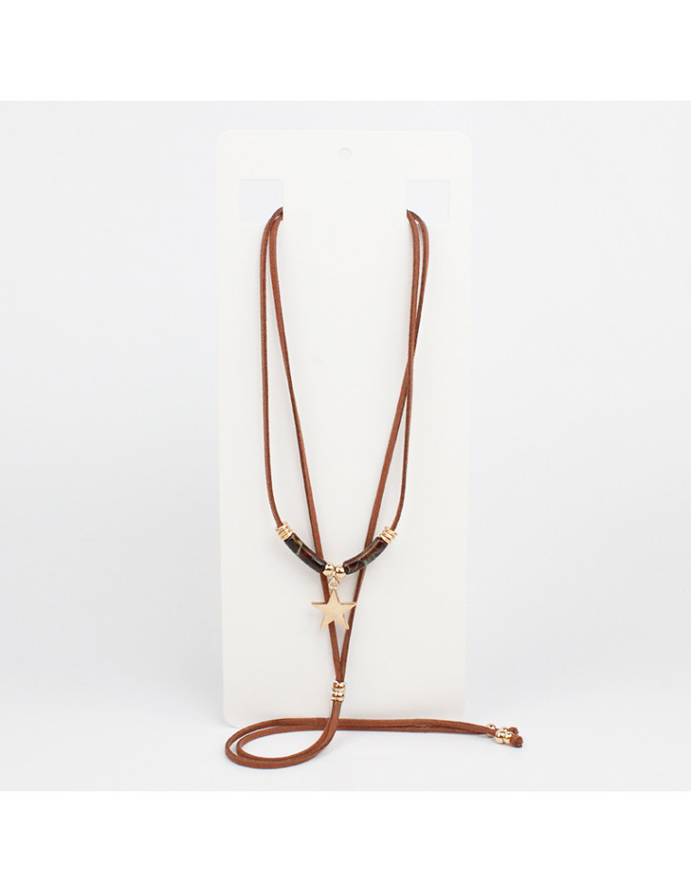 Collar corbatero de gamuzas, con piezas de acrílico marmolado y dije de fundición con forma de estrella.