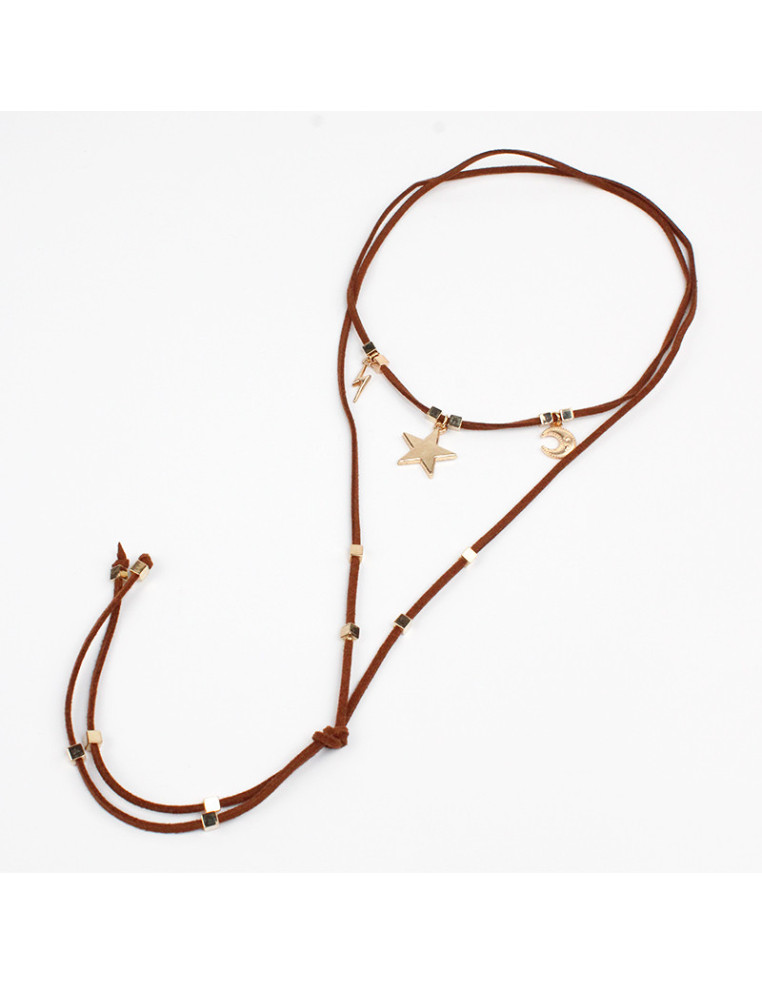 Collar de gamuza de múltiples vueltas, con dijes de fundición y terminales en punteras. Medida: 140cm de largo.