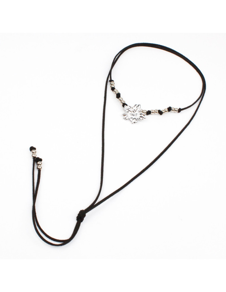 Collar de gamuza de múltiples vueltas, con dije de CCB con forma de flor y terminales en punteras. Medida: 140cm de largo.