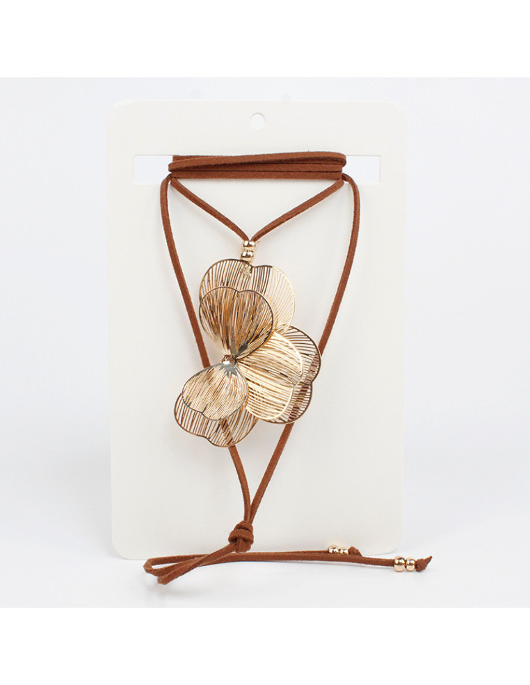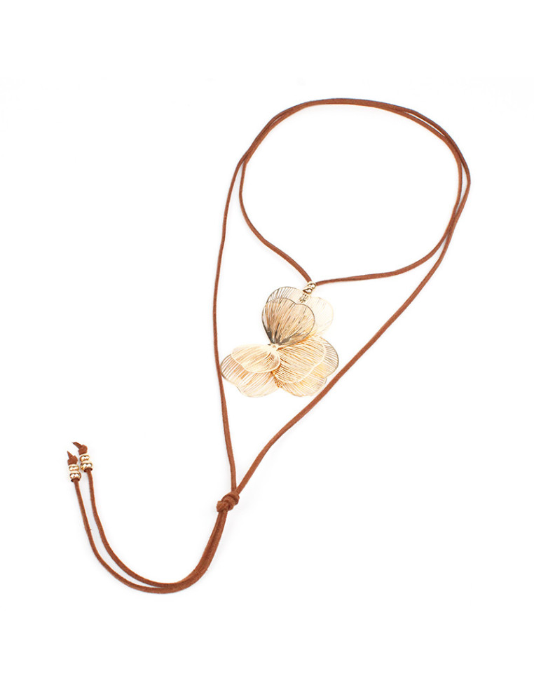 Collar de gamuza de múltiples vueltas, con dije de metal con forma de flor y terminales en punteras.