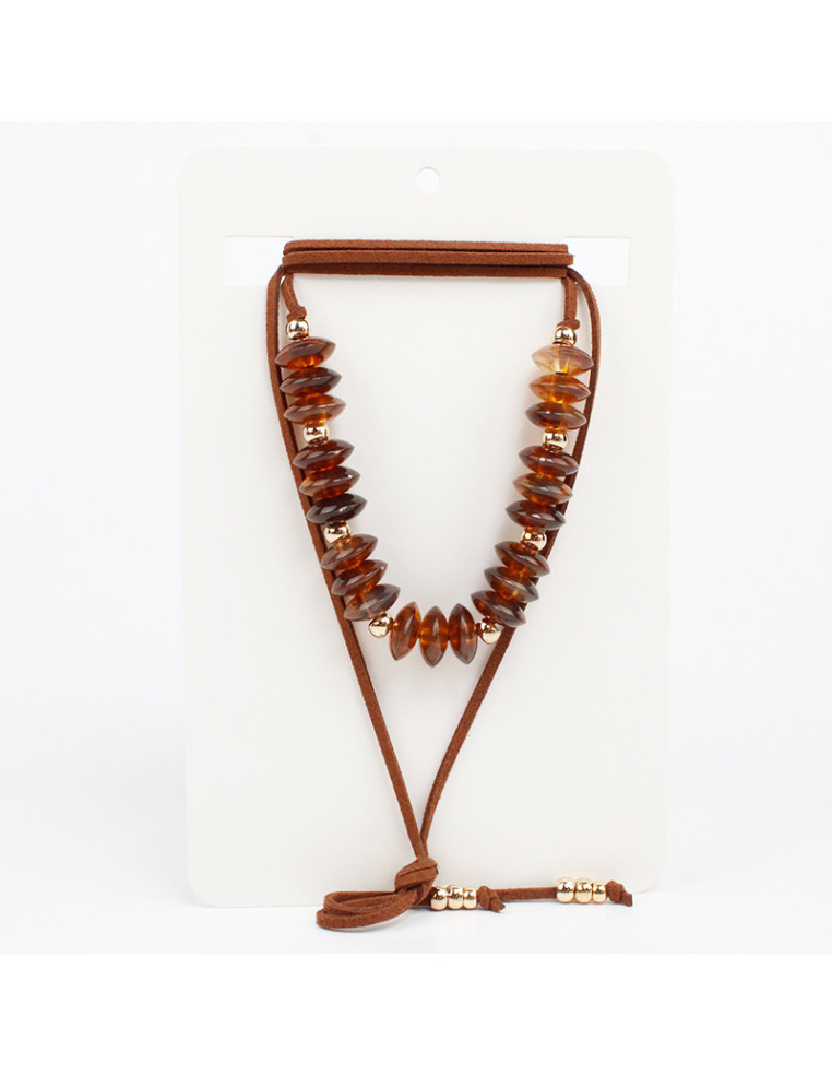 Collar de gamuza de múltiples vueltas, con piezas de acrílico, pasantes de CCB y terminales en punteras.