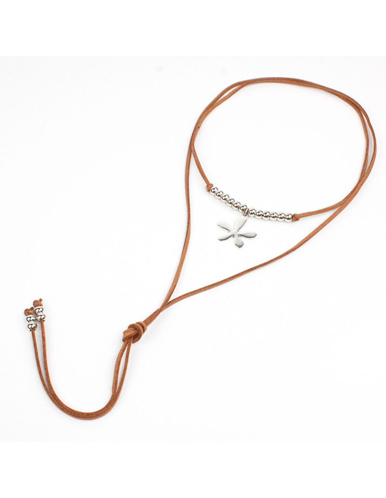Collar de gamuza de múltiples vueltas, con dije de fundición con forma de flor y terminales en punteras.