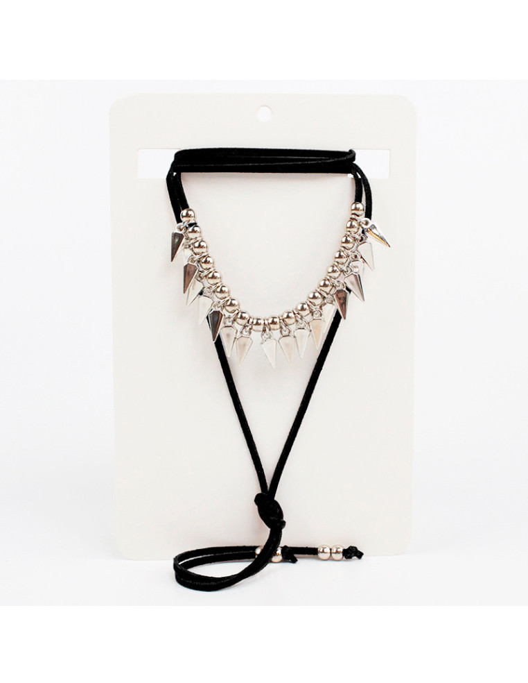 Collar de gamuza de múltiples vueltas, con dijes de fundición y terminales en punteras.Medida: 140cm de largo.