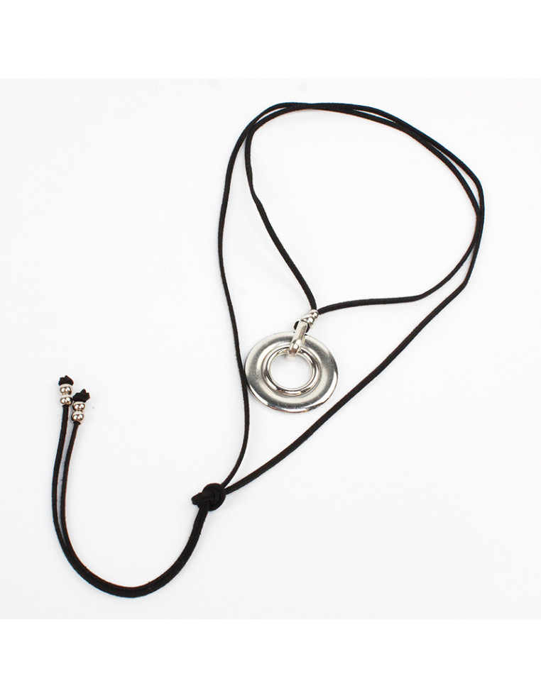 Collar de gamuza de múltiples vueltas, con dije de CCB con forma de círculo y terminales en punteras. Medida: 140cm de largo.