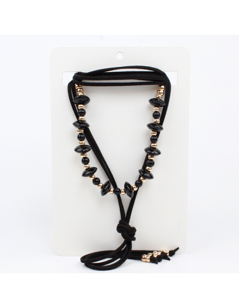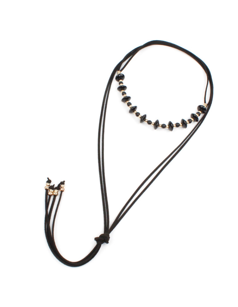 Collar de gamuza de múltiples vueltas, con piezas de acrílico, bolitas de vidrio pasantes de CCB y terminales en punteras.