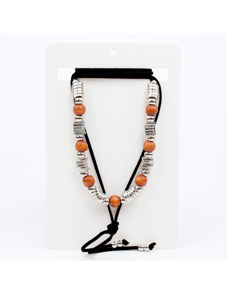 Collar de gamuza de múltiples vueltas, con piezas de madera, pasantes de CCB y terminales en punteras.